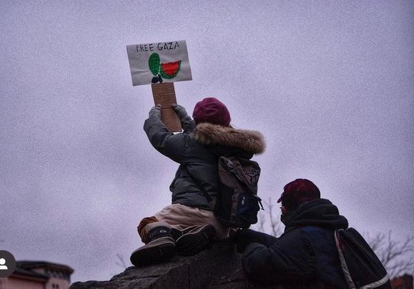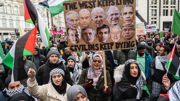 Palestinian flags, pro-Palestine banners with calls to protest and keffiyehs